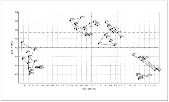 The results are presented as a mean ± SD (standard deviation). Statistical analysis and comparisons among means were carried out using the statistical package Statgraphics Centurion (V16.2.04 for Windows 7). All data were analysed by ANOVA at a significance level of 5%, followed by Fisher’s test. Principal component analysis (PC1–PC2) was applied to the results obtained by the electronic nose.