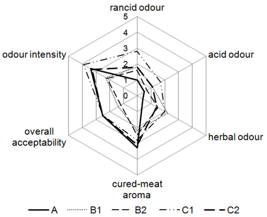 Sensory evaluation of dry fermented sausages at the 28th day of ripening. A: 0.3% ascorbic acid + 0.3% dextrose; B1: 0.5% SLE + 0.3% dextrose; B2: 0.1% SLE + 0.3% dextrose; C1: 0.5% SLE + 1% dextrose; C2: 0.1% SLE + 1% dextrose.