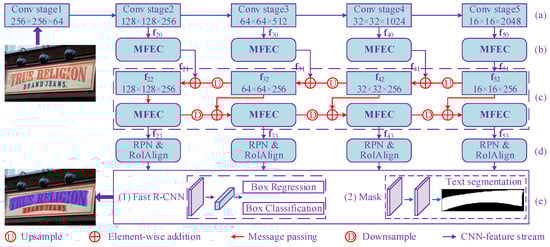The architecture of MFECN consists of (a) Multi-stage Features Extraction, (b) Multi-scale Features Enhancement Cumulation, (c) Multi-level Features Fusion, (d) Text Proposal Generation, and (e) Text Instance Prediction [43]. Each box with aqua green represents a feature block. (a) MFECN takes a RGB image () as input, and exploits ResNet-50 as backbone to extract multi-level convolutional features; (b) On multi-level convolutional features, MFEC module is used to extract features of cumulative enhancement of representational ability; (c) MFECN first adopts a deep-to-shallow strategy to integrate multi-level features cumulatively based on current-level features and deep-level outputs, and then adopts a shallow-to-deep strategy to integrate multi-level features cumulatively based on current-level features and shallow-level outputs; (d) RPN is used to generate scene text proposals for sub-branches of Fast R-CNN and Mask; (e) Mask branch is used for text segmentation, while Fast R-CNN is used for bounding box regression and text classification.