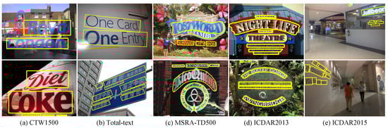 - Wang, X.; Jiang, Y.; Luo, Z.; Liu, C.-L.; Choi, H.; Kim, S. Arbitrary shape scene text detection with adaptive text region representation. In Proceedings of the IEEE Conference on Computer Vision and Pattern Recognition, Long Beach, CA, USA, 16–20 June 2019; pp. 6449–6458. [Google Scholar] [CrossRef]