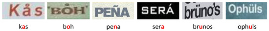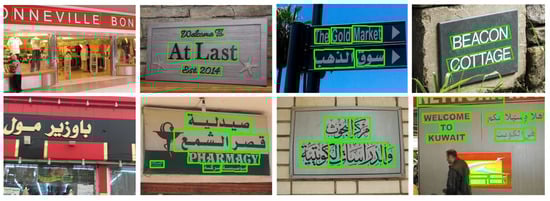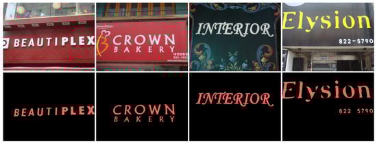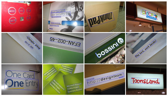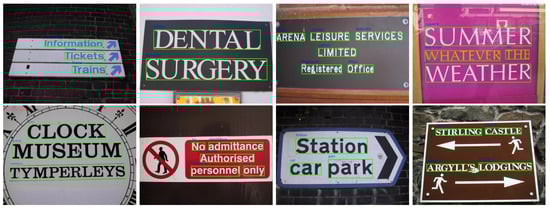 - Iwamura, M.; Matsuda, T.; Morimoto, N.; Sato, H.; Ikeda, Y.; Kise, K. Downtown osaka scene text dataset. In Lecture Notes in Computer Science, Proceedings of the Computer Vision–ECCV 2016 Workshops, Amsterdam, The Netherlands, 8–10, 15–16 October 2016; Springer: Cham, Switzerland, 2016; pp. 440–455. [Google Scholar] [CrossRef]