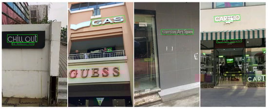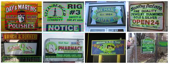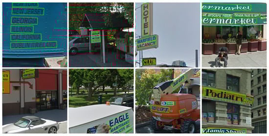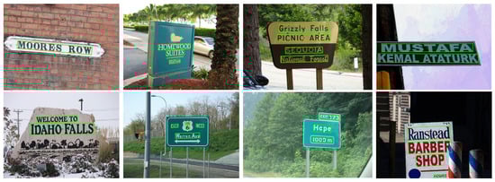 - Zhang, C.; Peng, G.; Tao, Y.; Fu, F.; Jiang, W.; Almpanidis, G.; Chen, K. ShopSign: A Diverse Scene Text Dataset of Chinese Shop Signs in Street Views. arXiv 2019, arXiv:1903.10412. [Google Scholar] [CrossRef]