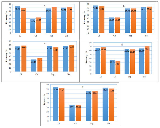 The histograms (Figure 1) show the dependence of lithium, sodium, calcium, and magnesium extraction on the duration of the sorption process for the studied cation exchangers according to Formula (2).