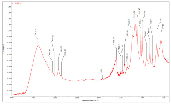 The spectrum contains stretching vibrations νOH of water molecules and νOH in SO3H groups at 3405.30 cm−1. Wavenumbers 3069.36 and 3028.50 cm−1 correspond to C-H stretching in aromatic rings. СH2 group stretching vibrations are characterized by wavenumbers 2928.63 and 2860.53 cm−1. CH deformation vibrations in СH2 groups are characterized by 1457.76 and 1421.44 cm−1 [27].