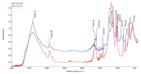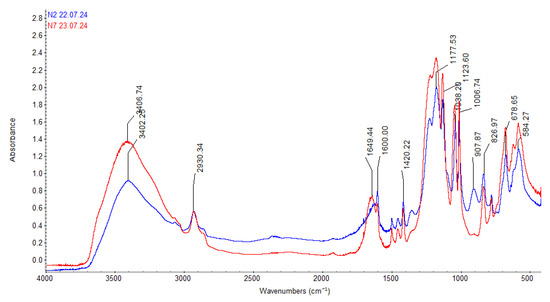 As shown in Figure 3, the IR spectrum profile of TOKEM-140 after sorption (curve 2, red) changes slightly. By comparing the wavenumbers (Table 3), a slight shift of certain bands toward the high-frequency region can be observed, indicating the occurrence of the sorption process.