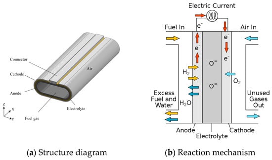 Structure and mechanism of a flat tubular SOFC (the brown arrows for fuel flow, the blue for air/water flows, and the red for electron flow).