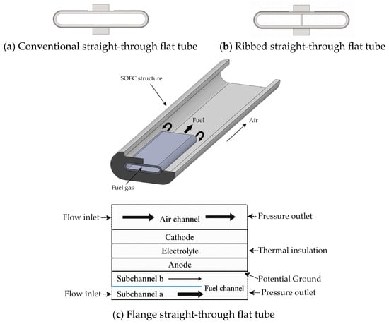 The 3D models of the three different structural types of connectors are shown in Figure 2. Figure 2a shows the straight-through flat-tube SOFC structure. Compared to the traditional cylindrical structure [9,26], it helps achieve better heat distribution, and reduces heat loss and temperature fluctuations, thereby enhancing the stability of the cell at high temperatures. Additionally, the flat-tube structure allows for more compact arrangement of multiple cell units, thereby improving system integration and space utilization. Figure 2b shows the ribbed straight-through flat tube. Adding ribs between the flat-tube anodes further increases the fuel gas reaction area and enhances heat transfer. Figure 2c is the flange-type straight-through flat tube. Compared to the traditional flat tube, it adds a flange-shaped inlet (an inner tube) at the entrance.