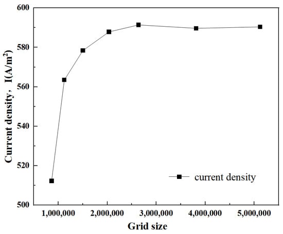 As is well known, grid independence must be satisfied for a numerical simulation process, as it ensures both the reliability of numerical results and the reasonable usage of computation resources. A test has been conducted by gradually refining the mesh to search a suitable grid size. As shown in Figure 3, where represents the current density, of the grid sizes of 865,050, 1,123,020, 1,503,650, 2,035,200, 2,640,150, 3,812,540, and 5,120,103, the size of 2,640,150 was found to be the minimum, which guarantees that the change in current density under the condition of a voltage of 0.8 V tends to be stable, and the difference is less than 1.0% with an increasing size. Obviously, this size ensures not only calculation reliability but also minimum usage of computing resources.