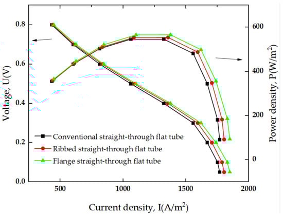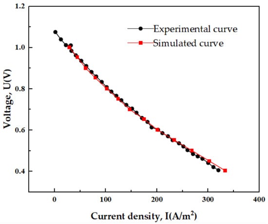 In order to ensure the accuracy of the numerical analyses based the above-mentioned numerical methods, a straight-through circular pipe model was established for validation of the methods. The polarization curve obtained from numerical simulation at 1023 K and 1 atm was compared with the experimental results from the literature [32] to validate the correctness of the numerical model. The operating temperature, pressure, materials, and geometric dimensions of the model were all consistent with the basic experimental conditions. The results, as shown in Figure 4, indicate that the error is within 5%, proving that the numerical multi-physical solvers and models produce reasonably accurate results for a circular tube SOFC case. It is also reasonable that the numerical methods were applied to solve the multi-physical fields in a flat-tube SOFC. For the latter cases, it was not so feasible at this point to find appropriate experimental work to validate them in a direct and exact way. All the case details for parameter study in this work were summarized in Table 3.