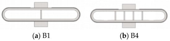 To investigate the impacts of the number of ribbed anode current collectors on the SOFC performance, the current collector ribs are arranged uniformly along the plane length. A total of four different SOFC models were established with the number of ribs as the independent variable. For convenience, these models are named B1, B2, B3, and B4. Except for the number of ribs, all other parameters are the same. The geometric models of B1 and B4 are shown in Figure 5.