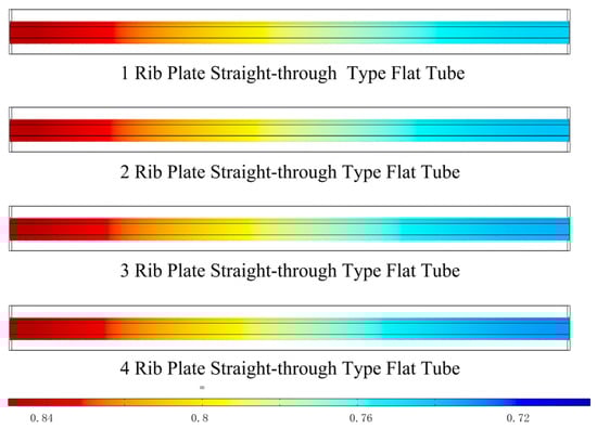 As shown in Figure 6, fuel gas consumption initially increases rapidly as the number of ribs in the flat tube rises. Once the number reaches three, however, the rate of increase in consumption slows down. Throughout this process, fuel gas continues to be consumed rapidly in the tube’s second half. This pattern indicates that altering the rib count affects the internal flow fields, changing the fuel gas distribution within the channel. Collectively, these effects suggest that increasing the number of ribs can enhance the effectiveness of the electrochemical reaction.