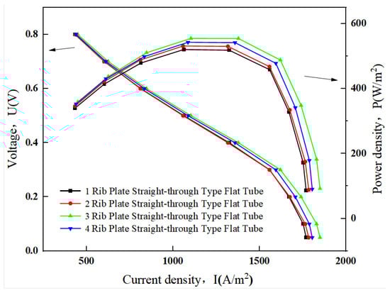 Figure 7 demonstrates that as the number of anode current collector ribs increases, the maximum current density of the SOFC rises from 1769.92 A/m2 to 1835.59 A/m2, representing a 3.73% improvement, and the maximum power density increases from 521.3 w/m2 to 563.2 w/m2, an increase of 7.44%. In Figure 7 and some similar figures that follows, represents the power density, and U the voltage. The discharge curves generally show the same trend, with the largest difference occurring at the end of the curve. This is mainly due to the high current density at the end, reflecting the difference in ohmic polarization. The effect of increasing the number of current collector ribs on improving discharge performance becomes smaller, meaning that, as shown in Figure 6, the gradient of the maximum power increase is gradually decreasing.