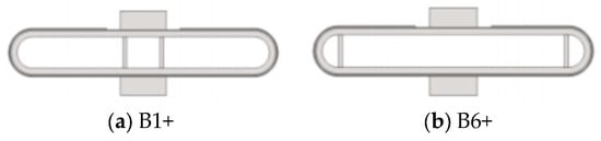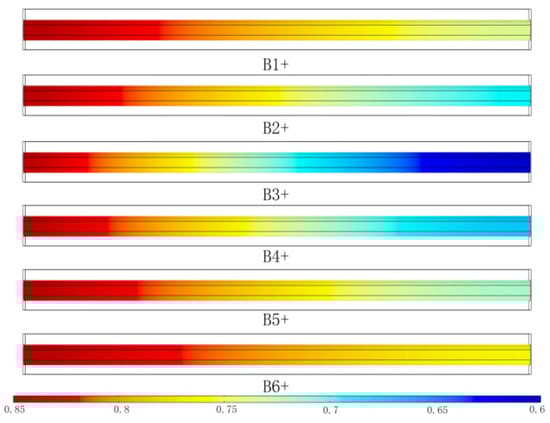 To investigate the effect of the arrangement of anode ribs on SOFC performance, the distance between two anode current collector ribs is set as a variable. The distances between the ribs are set to 4, 8, 12, 16, 20, and 24 mm, resulting in the establishment of six different SOFC models, which are named B1+, B2+, B3+, B4+, B5+, and B6+. All other parameters are the same. The geometric models of B1+ and B6+ are shown in Figure 8. Numerical simulation calculations were performed on the models with different anode rib positioning arrangements.