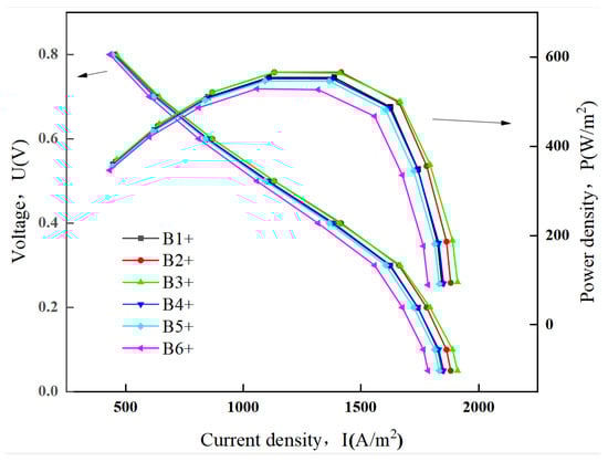 Figure 10 shows that as the rib position shifts, the maximum power density of the SOFC decreases from 1909.88 A/m2 to 1784.93 A/m2, a decrease of 6.54%, while the voltage corresponding to the maximum power remains nearly unchanged. From the discharge trend, it is evident that the discharge performance at all positions is similar during the initial phase, where electrochemical polarization is dominant, resulting in nearly identical output performance. The differences between them are mainly concentrated in the latter half, which is the ohmic polarization phase. When the ribs move closer to the arc region, the charge transport paths at the ribs align with the circumferential region, and at this point, increasing the distance between the anode ribs has a minimal effect on improving SOFC discharge performance and may further reduce its economic viability.