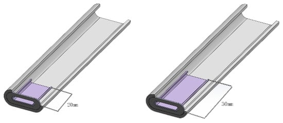 To investigate the effects of the inner tube length of the flange-type current collector on SOFC performance, four different SOFC models were established with inner tube lengths of 20, 30, 40, and 50 mm, respectively. For convenience, they are named B20, B30, B40, and B50. Except for the differences in inner tube length, all other parameters are kept the same. The geometric models of B20 and B30, on which numerical simulations were carried out, are shown in Figure 11.