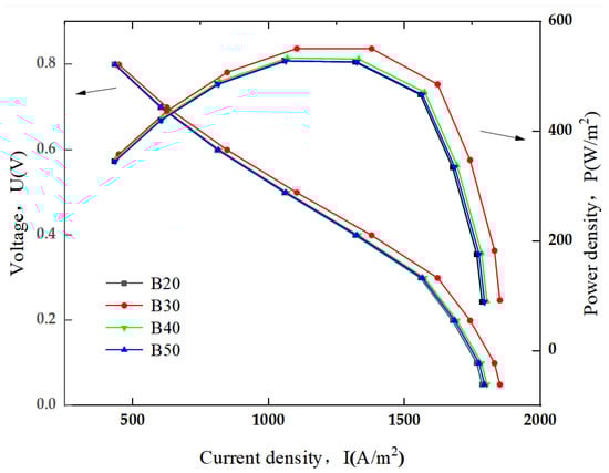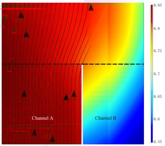As shown in Figure 13, the trends of the curves are generally the same. As the length of the flange-type inner tube gradually increases, the power density of the SOFC first increases and then decreases, peaking at a current density of 1103 A/m2. As the current density increases further, the output power density of the SOFC rapidly decays. From the output curves, it can be seen that when the inner tube length is 30 mm, the output power reaches its maximum value. Shortening or increasing the inner tube length both lead to a rapid decrease in output power. In fact, the flange-type inner tube functions as a nozzle, from which fuel gas injects into the channel and mixes with the gas around and ahead. That particular flow pattern leads to a stagnation or wake zone near the outlet of the inner tube. On the other hand, the jet in the meantime diffuses in the transverse direction, which results in a thicker low-speed or viscous layer near the channel wall outside. As shown in Figure 14, the jet stream in sub-channel A remains in the axial or main direction but diffuses transversely, and a stagnation region forms in sub-channel B. The stagnation region and the near-wall low-speed layer developed along the main stream direction allow longer residence time, which leads to a higher conversion of fuel gas considering the limited diffusion and reaction rates in anode and electrolyte layers, because the latter processes are usually much slower than species transport in the flow stream. That explains why the hydrogen mole fraction in sub-channel B is much lower than that in sub-channel A. Obviously, the inner tube results in a more complex entrance flow field that restrains the local reaction but improves the total reaction rate by increasing the hydrogen residence time along the whole channel. However, the total reaction rate may also be restrained if the inner tube is too long, since fuel species could not reach backward to the far end of the stagnation zone by diffusion. Therefore, the length of 30 mm seems to be the optimal value. On the other hand, the inner tube length would influence the flow resistance in a complex way, which may be the same way as it affects the reaction rate, considering the analogy between mass transport and momentum transport.