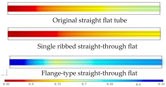 The flat-tube SOFC in this paper uses the same-side air intake method. Figure 15 shows the hydrogen molar fraction distribution on the anode side. At a working voltage of 0.8 V, the hydrogen molar fraction at the anode channel inlet is 0.8 for all models. The hydrogen molar fractions at the flow channel outlets for the conventional, ribbed, and flange-type connector structures are 0.72, 0.71, and 0.61, respectively. This indicates that under the same boundary conditions, the hydrogen utilization in the flange-type connector structure is much higher than in the other two structures.