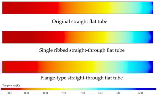The uniformity of temperature has a significant impact on the failure of SOFCs, mainly with respect to thermal stress/cracks, material degradation, and thermal runaway. The two former points are certainly self-explanatory. Regarding thermal runaway, a more exact expression would be a positive-feedback-like interaction between hot spots/regions and their enhanced reaction and heat generation. Strong nonuniform temperature will lead to large difference in the rate of electrochemical reactions in an SOFC, while in regions with higher temperatures, the reactions may be too intense, resulting in local overheating. Therefore, improvement of temperature distribution in the SOFC is also a goal of this work. Figure 17 shows the temperature distribution of three different SOFC connection structures at a working voltage of 0.8 V. The increase in cell temperature is primarily caused by the heat generated from electrochemical reactions within the cell, activation polarization heat, and the ohmic heat from contact resistance. The temperature in all three connection structures of the SOFC gradually decreases along the gas flow direction. Compared to the conventional flat-tube structure, the ribbed SOFC has a similar initial reaction temperature. Under certain conditions, due to the increase in the number of ribs, the reaction area also increases, accelerating the reaction, and the temperature rise finishes in a shorter time. The SOFC with a flange-type structure has a smaller tube diameter at the fuel gas channel inlet, but the flow rate at the inlet is fixed, so the gas flow speed inside the channel increases. The rapid gas flow carries away more heat, resulting in an overall lower temperature compared to the other two structures. In addition, the flow rate of cathode gas is much greater than that of anode gas, leading to more heat being dissipated through convection. Therefore, along the flow direction, the temperature in the cathode flow path rises slower than in the anode.