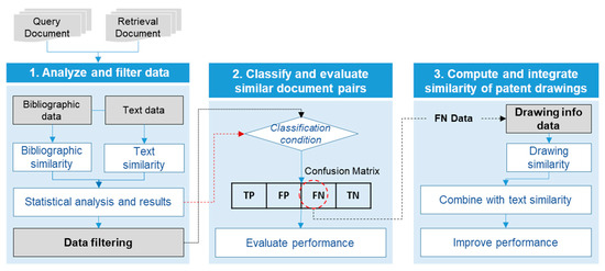 To assess the similarity of patent documents, this study utilizes three elements of patent documents (text, bibliographic information, and drawings) and proposes a multimodal approach, weak AI, and the conceptual similarity of patent drawings. In Step 1, textual and bibliographic similarity between two documents (Query Document and Search Document) are calculated. Data noise is removed and filtered based on statistically significant results. In Step 2, statistical analysis results and a rule-based system are used to classify the filtered data into four types. In Step 3, conceptual similarity of patent drawings is calculated for the FN-classified dataset and combined with text similarity. Additionally, the experimental results verify that the classification accuracy is improved and that it shows better results than single-modality and arithmetic combination methods. The process of the similarity assessment for patent documents using a multimodal approach is shown in Figure 3.