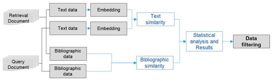 The correlation analysis between bibliographic similarity and text similarity is repeated for each filing year of the searched document, calculating a correlation index for each year. This correlation is related to the time-series flow of the query document and the searched document. Based on the query document, the filing year of the searched document with the highest correlation index is identified, and the start date of the searched document is adjusted to that filing year. This approach helps reduce false positives (FPs) and false negatives (FNs) by narrowing the time span of the retrieved documents and refining the classification of similar document sets. The overall input, analysis, and filtering procedures for the full dataset are illustrated in Figure 4.