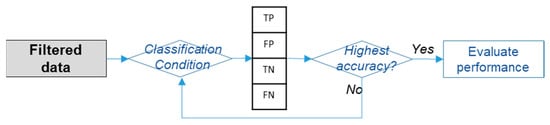 The classification results obtained using a rule-based system are evaluated using a confusion matrix. This matrix systematically identifies discrepancies between predicted and actual classes and consists of four components: true positive (TP), false positive (FP), false negative (FN), and true negative (TN). A confusion matrix is primarily a metric used to classify data using machine learning models and analyze classification results []. However, it is also useful in rule-based classification systems, as it allows for the easy identification of the impact of each rule on classification accuracy. Performance evaluation metrics include accuracy, precision, recall, and F1 score, and MAP/NDCG metrics can be additionally utilized.