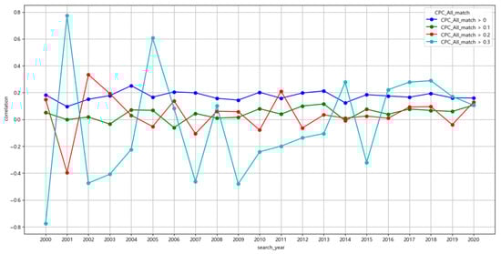 Previous studies have used IPC co-classification analysis [,,,] or backward citation information [,,,] to analyze the similarity of two patent technologies. However, there has been no empirical evidence of any statistical correlation between text similarity and bibliographic similarity, such as IPC co-classification codes or backward citation information. Statistical approaches can be proven through correlation analysis of text similarity and bibliographic similarity for patent data within a certain technological category.