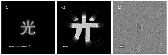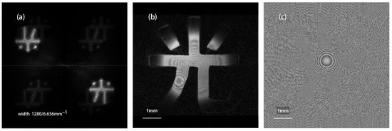 The theoretical simulation image of Equation (10) without diaphragm P. (a) The hologram spectrum (image width 1280/6.656 mm−1); (b) the amplitude of the reconstructed image (image width 6.656 mm); (c) the phase of the reconstructed image (image width 6.656 mm).