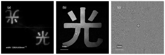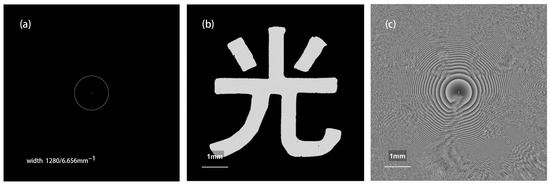 A theoretical simulation image of Equation (10) with the diaphragm is shown in Figure 4. Figure 4a is a spectral amplitude image of the ideal image with a secondary phase factor in Equation (10), where the ring is a filter window formed by the transfer function. The imaging light field amplitude obtained by inverse Fourier transformation based on the spectrum within the filter window is shown in Figure 4b, and its phase image is shown in Figure 4c. It can be seen that the spectral amplitude image of the ideal image with a secondary phase factor is similar to the Fresnel diffraction image with a distance of . Because the “spatial filtering” effect of the transfer function window makes the reconstruction look like an incomplete image, the physical significance of the transfer function discussed above is a good proof. A comparison with Figure 3 shows that the theoretical simulations yield excellent agreement with the experimental measurements.