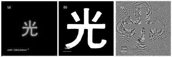 The pixel width of the experimental CCD is 0.0052 mm, with a pixel count of 1280 × 1024. When processing the experimental data, zero padding is used to transform the hologram into a square hologram with a width of 1280 pixels and a width of Li = 6.656 mm. After processing the hologram to eliminate zero-order diffraction interference [1], the spectrum image is obtained by the Fast Fourier Transform (FFT), as shown in Figure 3a. After extracting the spectrum from the lower right corner, the reconstructed image of the amplitude of the image light field is obtained by the Inverse Fast Fourier Transform (IFFT), as shown in Figure 3b, and Figure 3c shows the phase distribution image of the image light field.