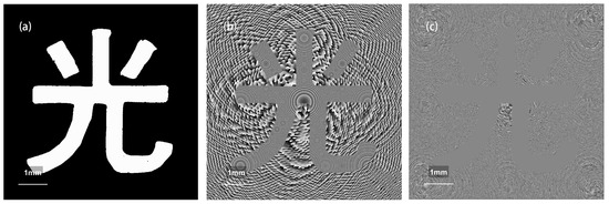 Figure 9a,b show the amplitude and phase distribution images of the image light field obtained using a hologram. Since the object plane is formed by the “光” character, the transmission holes should have an equal phase distribution. However, Figure 9b clearly shows a spherical wave phase distribution influenced by the illumination light and the imaging components of the imaging system, which does not match the actual situation. However, after obtaining the illumination light image light field without an object through numerical simulation, the accurate phase image in Figure 9c can be obtained using Equation (15).