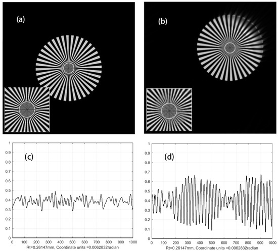 Based on the theoretical analysis of Equation (10), coherent optical imaging systems are no longer linear space-invariant systems. To clearly verify this conclusion, we follow the suggestion in reference [9] and replace the object plane in the experimental system shown in Figure 2 with a 40-petal Siemens star while retaining diaphragm P. We then perform theoretical calculations on the image light field of the Siemens star’s center, both on the optical axis and off the optical axis. The theoretical simulations indicate that the amplitude resolution varies across different regions of the image plane, with the resolution increasing as the distance from the optical axis increases. As an example, Figure 10 presents theoretical study images of resolution across different regions of the image plane. Figure 10a,b show the amplitude distribution of the image field normalized to a grayscale range of 0–255 when the center of the Siemens star coincides with the optical axis and when the center coordinates of the Siemens star are (u = 1 mm, v = 1 mm). The lower left corner of each figure displays a magnified image of the observed region. To study changes in amplitude resolution, sampling rings with a radius of 0.26 mm were drawn on each image with the center of the Siemens star as the center. Figure 10c shows the amplitude curve of the ring sampled counterclockwise along the right side of the ring in Figure 10a, and Figure 10d shows the amplitude curve of the ring sampled counterclockwise along the right side of the ring in Figure 10b.