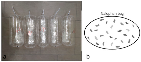 The adsorption test: (a) NalophanTM bags filled with flakes; (b) a schematization of the adsorption test.