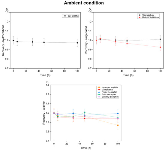 Recovery test—ambient conditions for hydrocarbon (a), oxygenated (b), and sulphur compounds (c).
