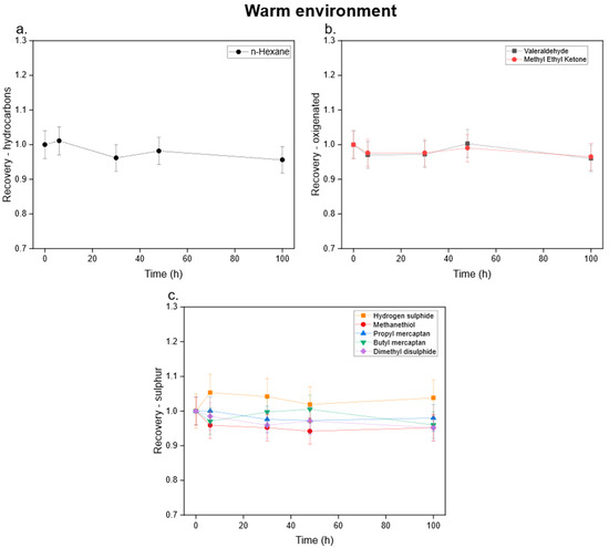 Recovery test—warm environment (35 °C and RH = 20%) for hydrocarbon (a), oxygenated (b), and sulphur compounds (c).