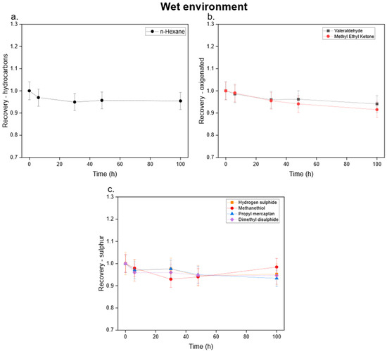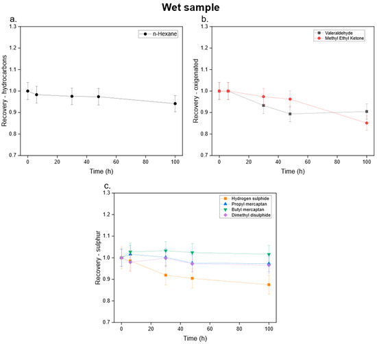 Recovery test—wet sample (20 °C, RHIN = 75%, and RHOUT = 55%) for hydrocarbons (a), oxygenated (b), and sulphur compounds (c).