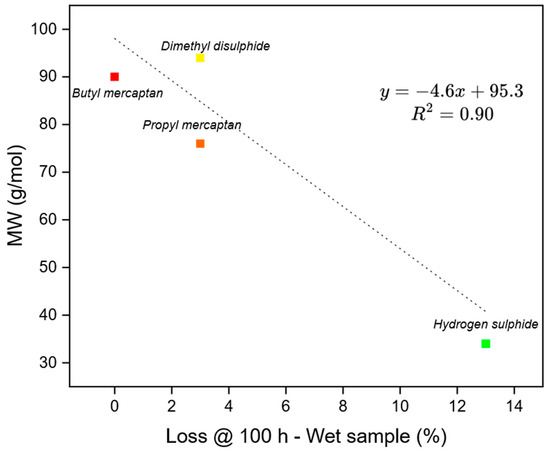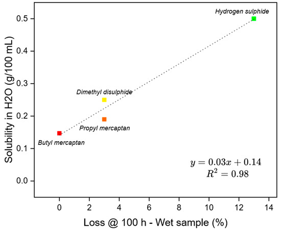 To validate these relationships, correlation analysis was performed between molecular weights and solubility of the studied sulphur compounds and their respective losses at 100 h (maximum experimental duration) in the wet sample test.