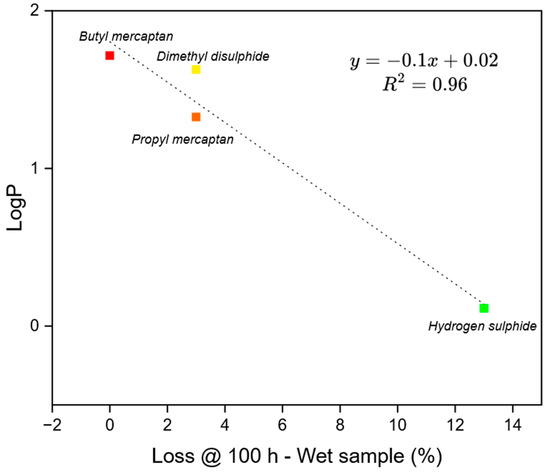 As demonstrated in Figure 7, it is evident that the presence of a longer carbon chain, which increases the hydrophobicity of the molecule (i.e., LogP), is associated with a higher recovery. Furthermore, considering compounds’ water solubility values, a graphical representation of the correlation between losses measured at 100 h and the solubility values for the sulphur compounds under this condition is provided (Figure 8).