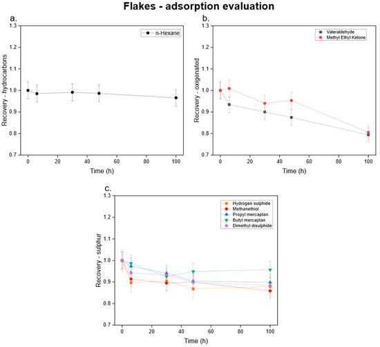 Recovery test—adsorption estimation with flakes in ambient condition (20 °C and RH = 55%) for hydrocarbons (a), oxygenated (b), and sulphur compounds (c).