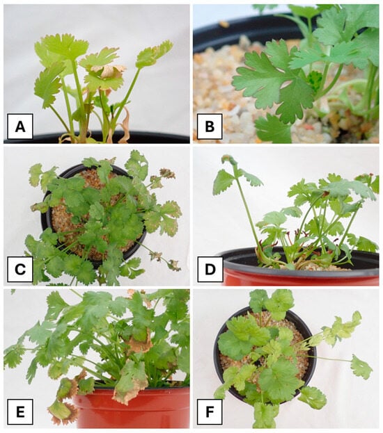 Coriandrum sativum ‘Santo’ visual macronutrient deficiency symptoms. (A) Nitrogen-deficient plants exhibited overall chlorotic foliage and stunted growth, with the leaf margins eventually reddening and becoming necrotic. (B) Initial symptoms of phosphorus deficiency were stunted growth and faint purpling of the leaf margins. (C) Potassium-deficient plants displayed stunted growth and interveinal chlorosis of the most recently matured leaves, coupled with necrotic speckling of the oldest leaves. (D) Calcium-deficient plants displayed necrosis of the newest growth and growing tips. Some leaves had a “cupped” appearance due to the death of the growing tip prior to leaf expansion. (E) Magnesium-deficient plants exhibited stunted growth and interveinal chlorosis of the older leaves, starting near the leaf margin and progressing inward. (F) Sulfur-deficient plants were stunted and had overall light green-yellow foliage, with the newest leaves having the lightest coloration.