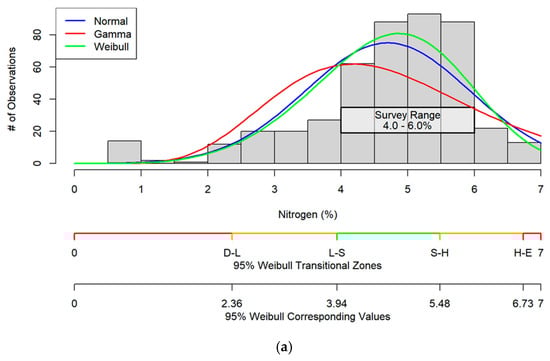 Out of the three models evaluated, a Weibull distribution best fit the N foliar concentration data based on the BIC value and visual fitness (Figure 2a, Table 2). A defined sufficiency range of 3.94% to 5.48% N (Table 4) slightly shifts the previously recommended range of 4.00% to 6.00% N for field-grown cilantro []. The deficiency value of 2.36% N for this distribution falls slightly below the 2.50% N tissue concentration observed in Expt. 1 for our N-deficient cilantro plants, although they displayed clear deficiency symptomology. This could be due to young plant age and size at the time of sampling, as tissue values are typically higher in young plants and decline due to the dilution effect as plant mass increases [].