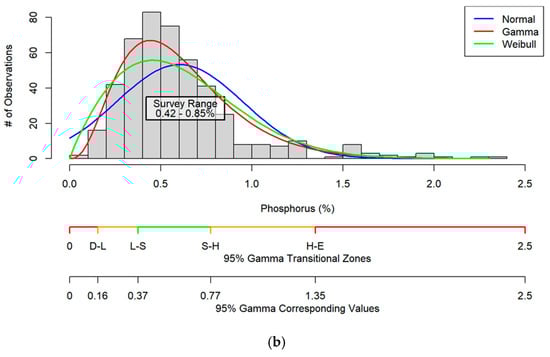 Nitrogen (a) and phosphorus (b) foliar concentrations of Coriandrum sativum modeled using Normal, Gamma, and Weibull distributions. Interpretation ranges are based on the denoted distribution with four transitional points of deficient to low (D–L), low to sufficient (L–S), sufficient to high (S–H), and high to excessive (H–E), which correspond to 2.5%, 25%, 75%, and 97.5% of sample observations (n = 463), respectively. Survey ranges from Bryson and Mills [] are overlayed for reference.