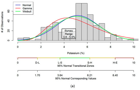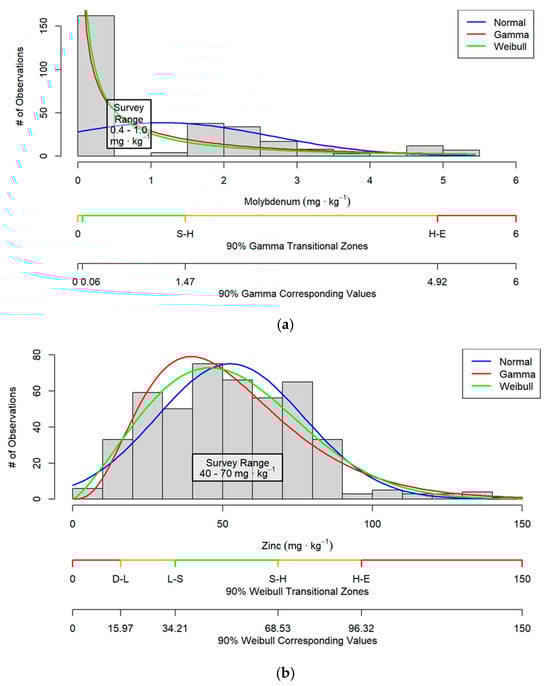 Molybdenum (a) and zinc (b) foliar concentrations of Coriandrum sativum modeled using Normal, Gamma, and Weibull distributions. Interpretation ranges are based on the denoted distribution with four transitional points of deficient to low (D–L), low to sufficient (L–S), sufficient to high (S–H), and high to excessive (H–E), which correspond to 5%, 25%, 75%, and 95% of sample observations; n = 286 and n = 463, respectively. For Mo, the deficient and low ranges were combined, creating one low range corresponding to the lowest 30% of sample observations. The survey ranges from Bryson and Mills [] are overlayed for reference.