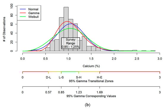 Potassium (a) and calcium (b) foliar concentrations of Coriandrum sativum modeled using Normal, Gamma, and Weibull distributions. Interpretation ranges are based on the denoted distribution with four transitional points of deficient to low (D–L), low to sufficient (L–S), sufficient to high (S–H), and high to excessive (H–E), which correspond to 2.5%, 25%, 75%, and 97.5% of sample observations (n = 463), respectively. The survey ranges from Bryson and Mills [] are overlayed for reference.
