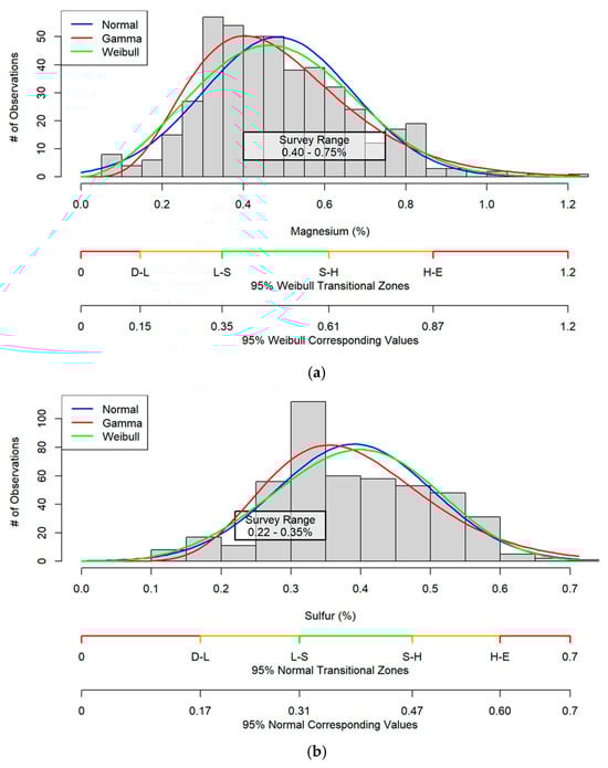 Magnesium (a) and sulfur (b) foliar concentrations of Coriandrum sativum modeled using Normal, Gamma, and Weibull distributions. Interpretation ranges are based on the denoted distribution with four transitional points of deficient to low (D–L), low to sufficient (L–S), sufficient to high (S–H), and high to excessive (H–E), which correspond to 2.5%, 25%, 75%, and 97.5% of sample observations (n = 463), respectively. Survey ranges from Bryson and Mills [] are overlayed for reference.