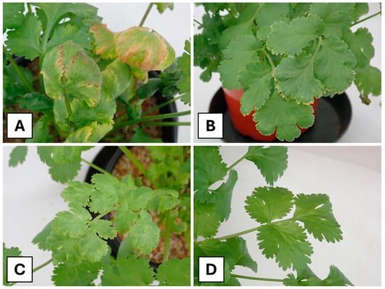 Coriandrum sativum ‘Santo’ visual micronutrient deficiency and toxicity symptoms. (A) Recently matured leaves of boron-deficient plants exhibited marginal chlorosis and a “cupped” appearance, with newer leaves and stems becoming thick and brittle. (B) Plants receiving the boron-toxicity treatment exhibited marginal chlorosis of the older leaves, which quickly turned into necrosis. (C) Iron-deficient plants exhibited interveinal chlorosis of the recently mature leaves. (D) Control plant.