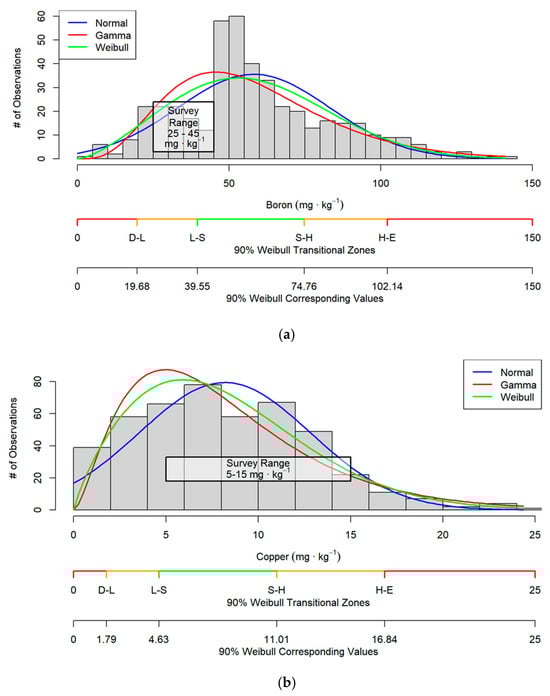 Boron (a) and copper (b) foliar concentrations of Coriandrum sativum modeled using Normal, Gamma, and Weibull distributions. Interpretation ranges are based on the denoted distribution with four transitional points of deficient to low (D–L), low to sufficient (L–S), sufficient to high (S–H), and high to excessive (H–E), which correspond to 5%, 25%, 75%, and 95% of sample observations (n = 463), respectively. The survey ranges from Bryson and Mills [] are overlayed for reference.