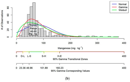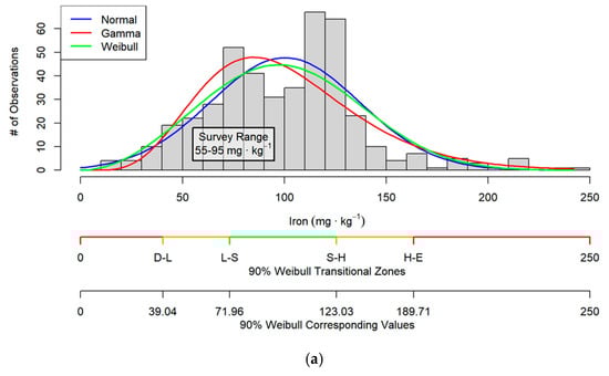 Iron (a) and manganese (b) foliar concentrations of Coriandrum sativum modeled using Normal, Gamma, and Weibull distributions. Interpretation ranges are based on the denoted distribution with four transitional points of deficient to low (D–L), low to sufficient (L–S), sufficient to high (S–H), and high to excessive (H–E), which correspond to 5%, 25%, 75%, and 95% of sample observations (n = 463), respectively. The survey ranges from Bryson and Mills [] are overlayed for reference.