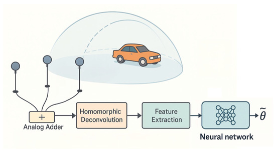 Figure 1 illustrates the system configuration, in which sound signals from a moving object are received by three spatially separated microphones, combined through an analog adder, and processed via homomorphic deconvolution, feature extraction, and a neural network to estimate the AoA.