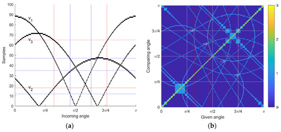 represent the inner products of each angle with itself, achieving a maximum value of 3 due to the three DDVs. Off-diagonal elements reflect the similarity between different angles, where larger values indicate identical or highly similar time delay patterns. The specific locations of maximum off-diagonal values are highlighted in