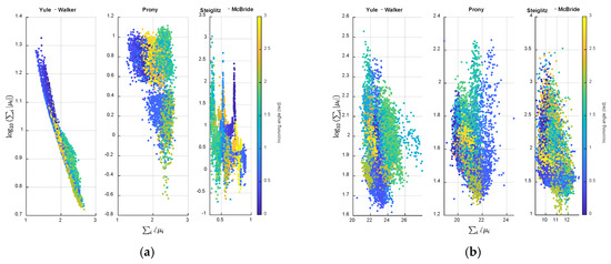 Figure 6a shows the nonparametric HD distribution for an incoming angle of 0 radians, where three dominant peaks correspond to the time delays between microphones. In contrast, the Yule–Walker (AR model) and Prony (ARMA model) show smooth evaluated distributions, with red lines marking pole locations and magnitudes. These methods tend to spread the dense population of peaks and may place some poles at irrelevant locations. The Steiglitz–McBride (ARMA model) provides a much more accurate reconstruction, with peak locations and magnitudes closely matching the nonparametric HD distribution. With a properly chosen model order (here in 3 order), the Steiglitz–McBride method demonstrates the best agreement with true time delays, offering the most promising feature extraction performance. Higher-order parametric HD models also show comparable results when the Yule–Walker and Prony methods are used.